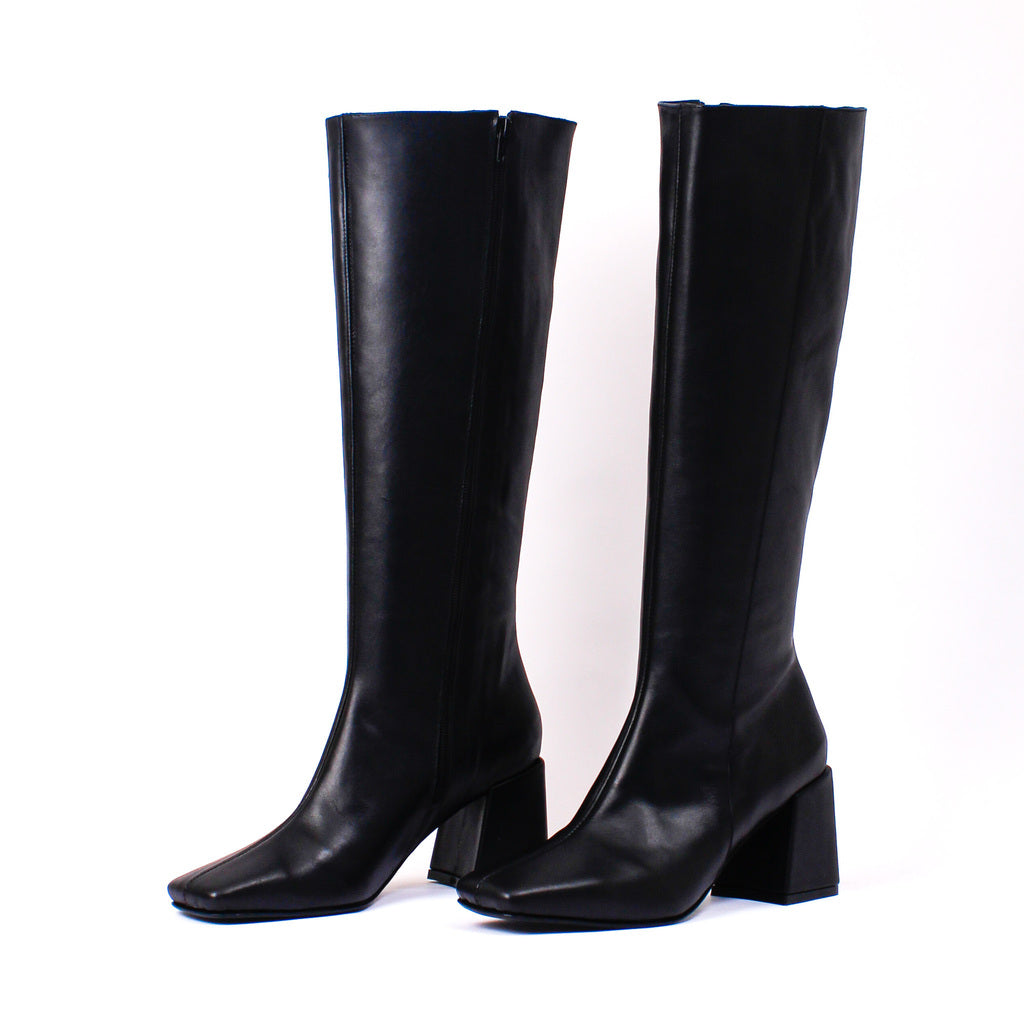 Bota de caña alta confeccionada íntegramente en cuero vacuno con cierre en el lateral interno y detalle de punta cuadrada y taco forrado en cuero.