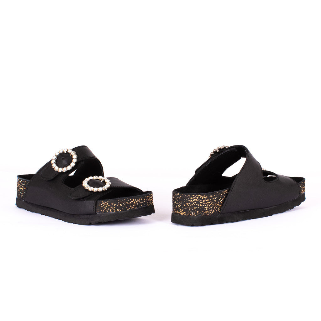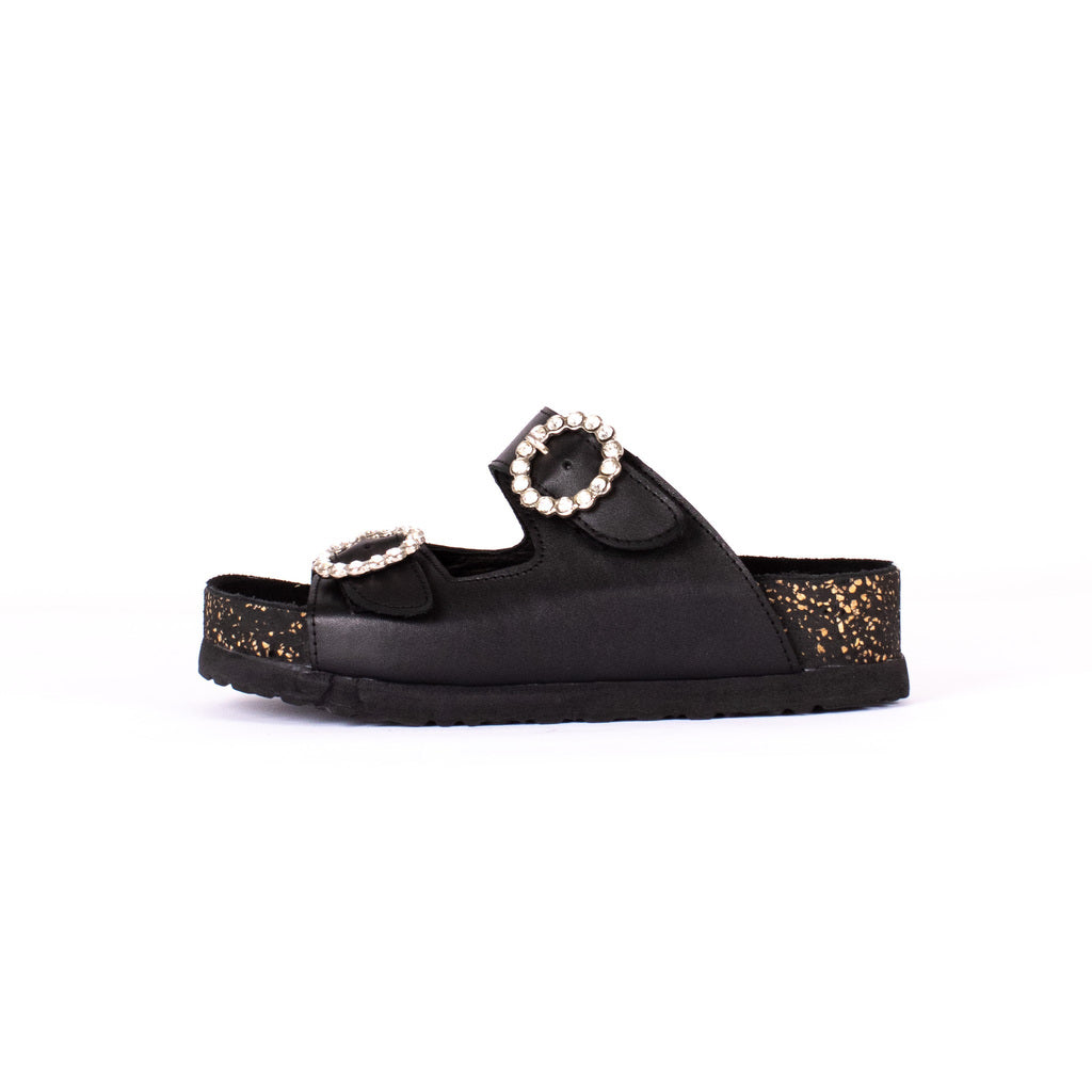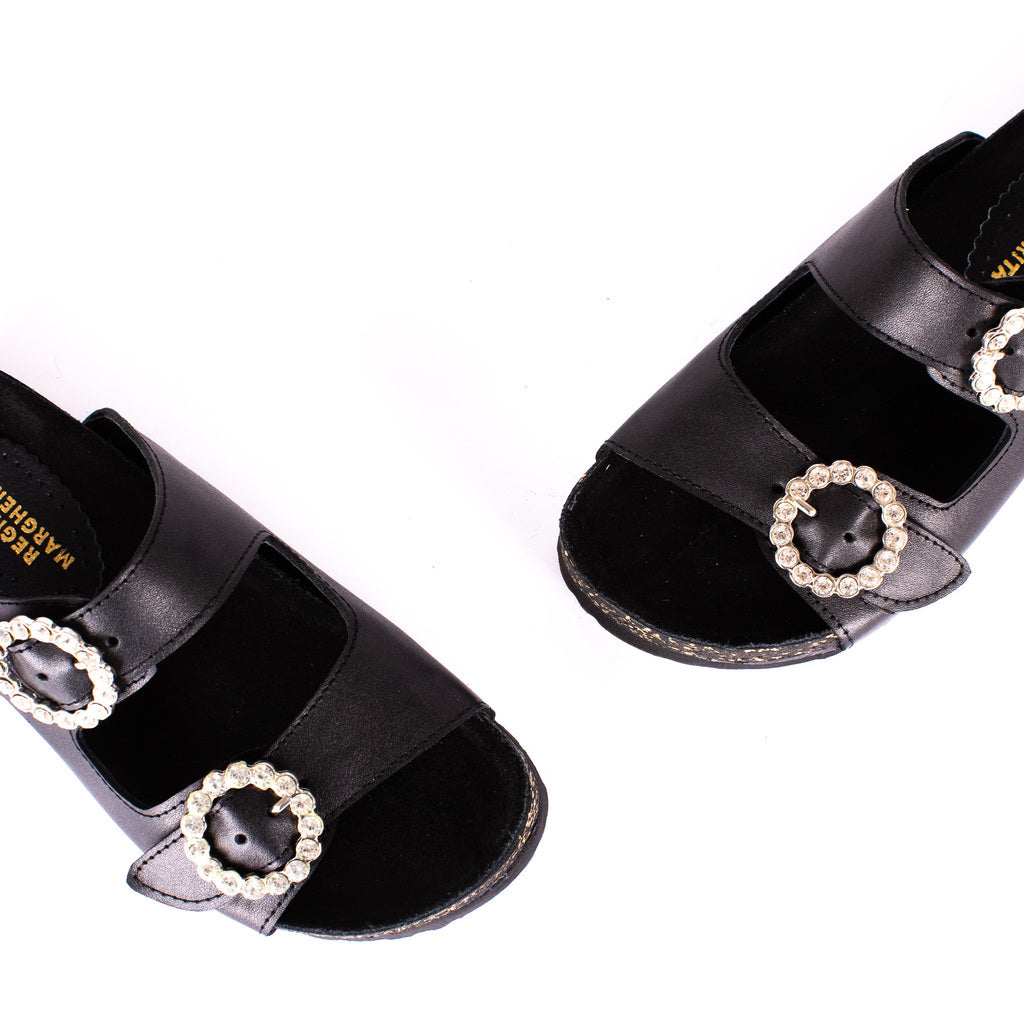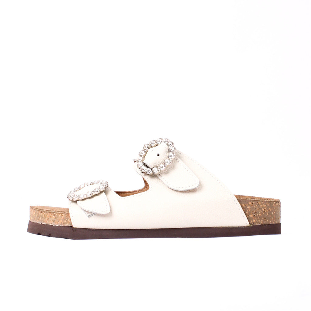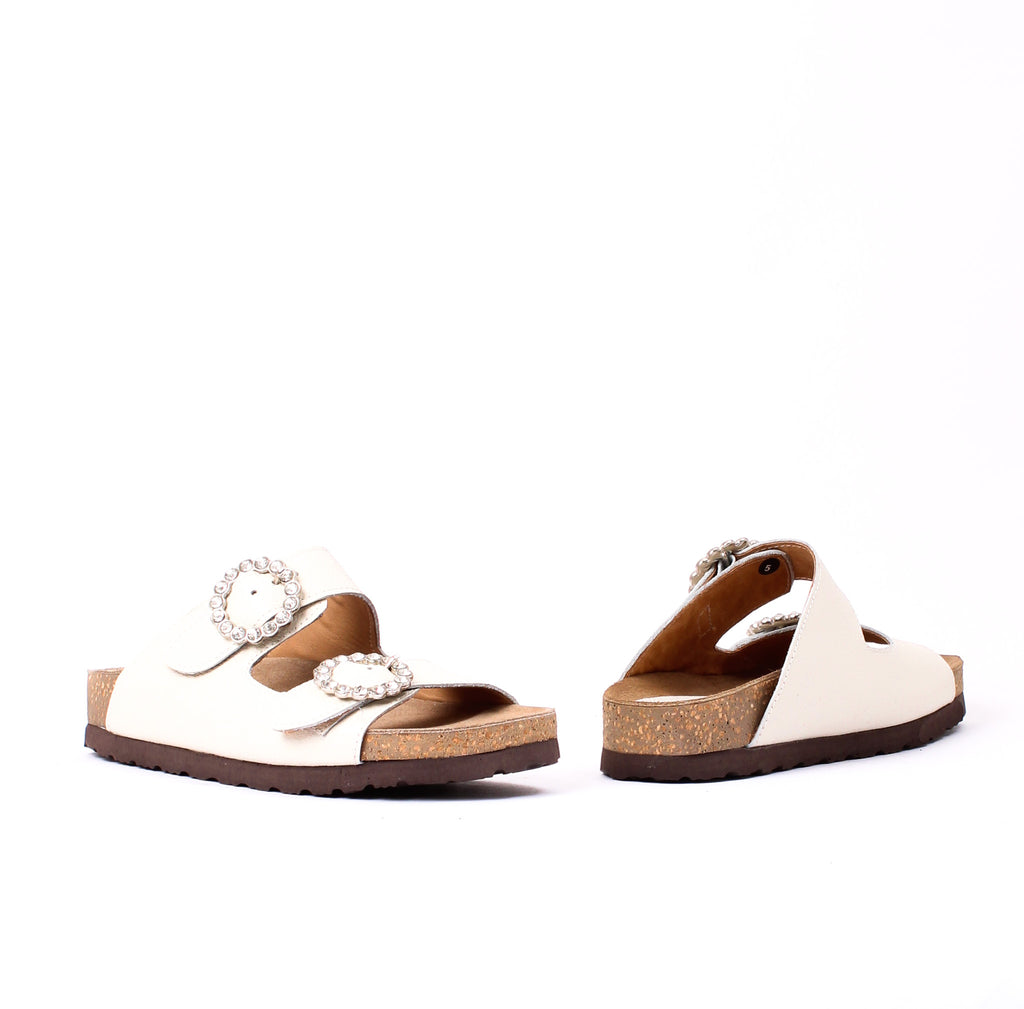 Sandalia confeccionada íntegramente en cuero y forrería en cuero, regulable con detalle de hebilla con strass.