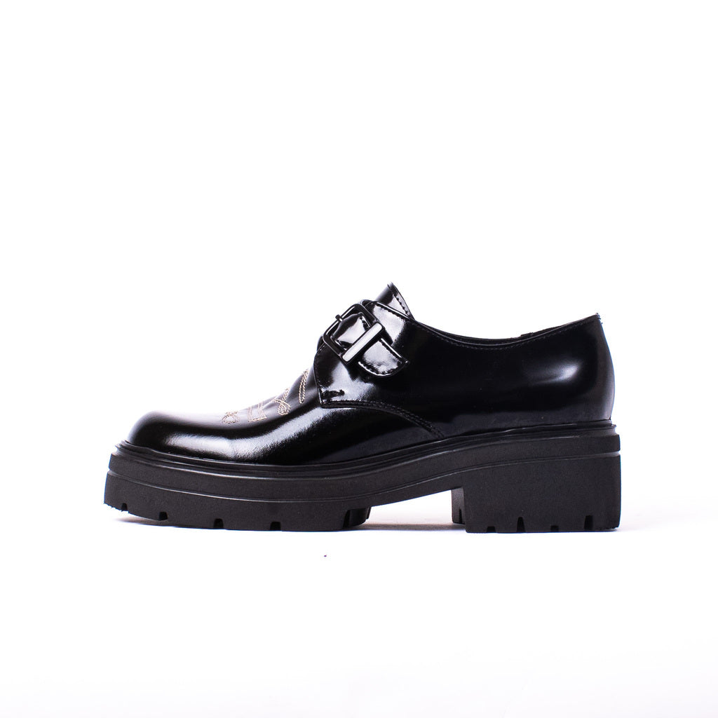 Mocasines confeccionados íntegramente en cuero alto brillo color negro y con forrería en cuero, detalle de hilado color blanco en capellada y un toque style hebilla a tono. Su base es de goma eva por lo que son muy livianos y cómodos, sin duda son un comodín para lograr un look comfy y canchero.