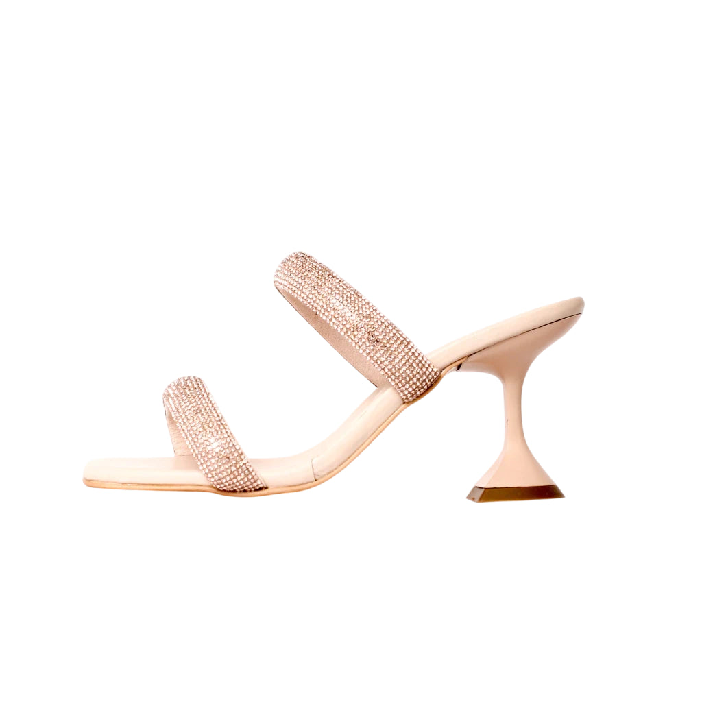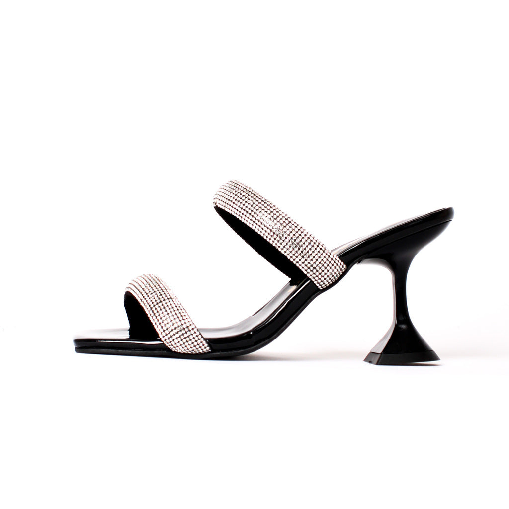 Sandalias con dos tiras confeccionadas en strass y detalle de taco de diseño. Este diseño es apto vegano.