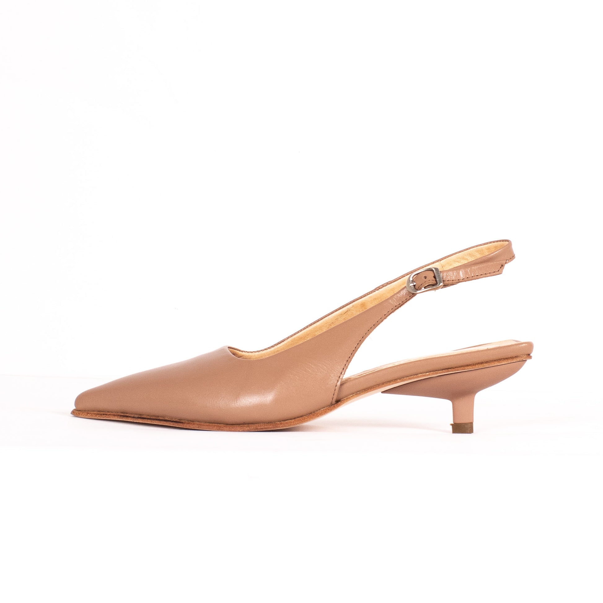 Zapatos estilo kitten heels confeccionados íntegramente en cuero con detalle de hebilla color níquel.