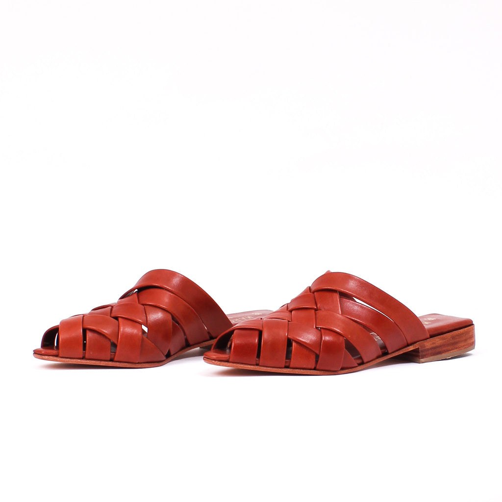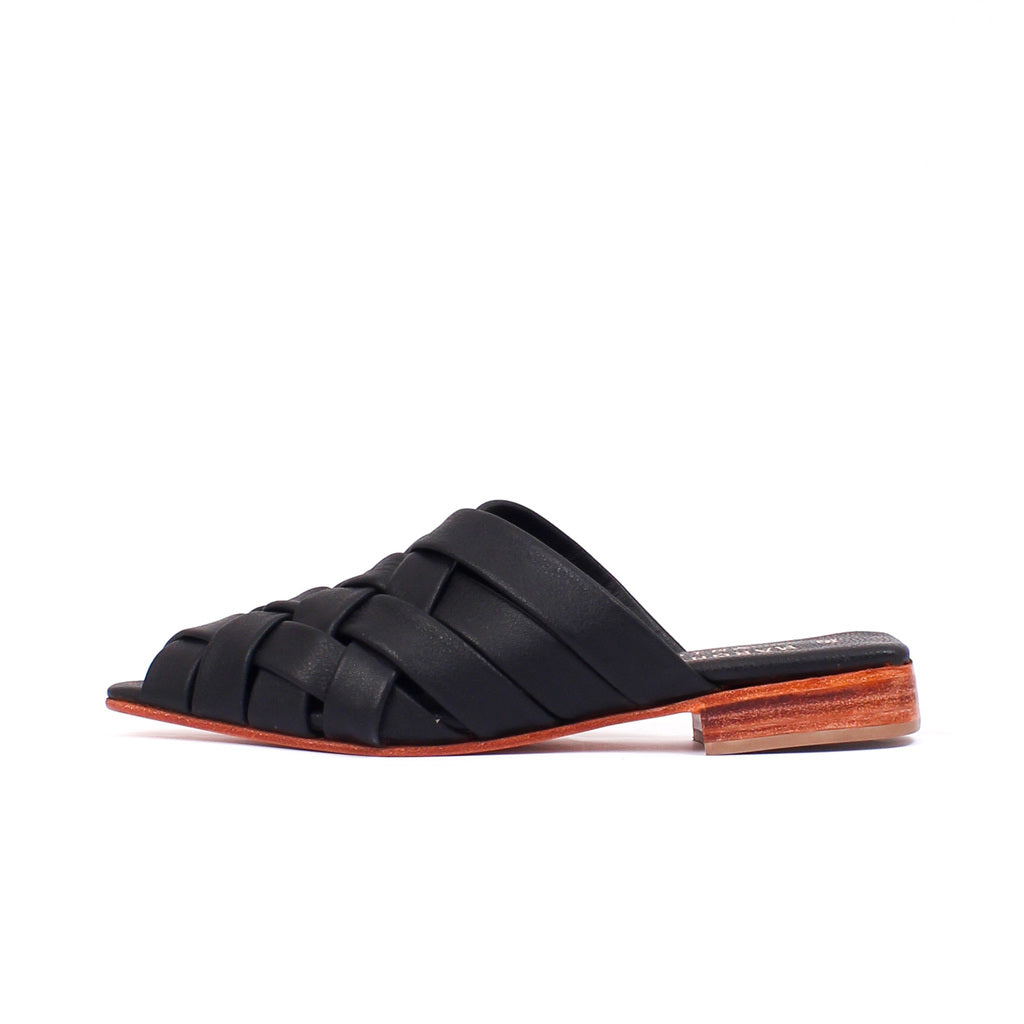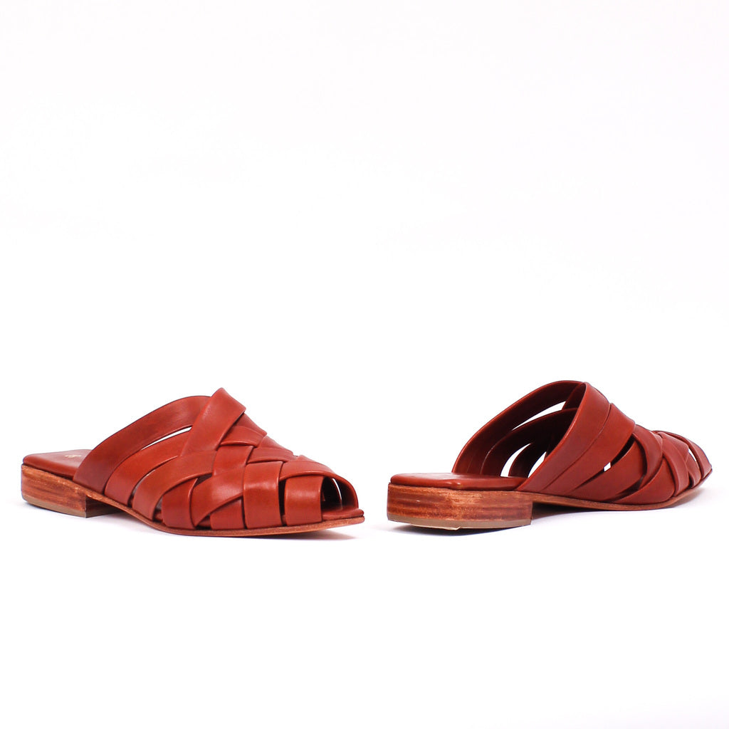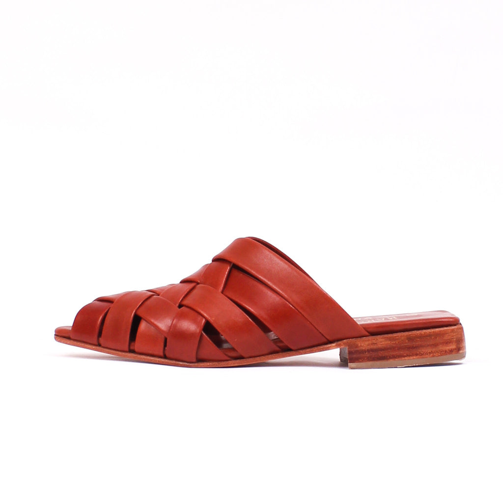 Zueco confeccionado íntegramente en cuero vacuno con detalle de tiras entrelazadas.