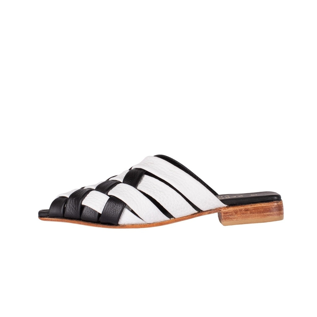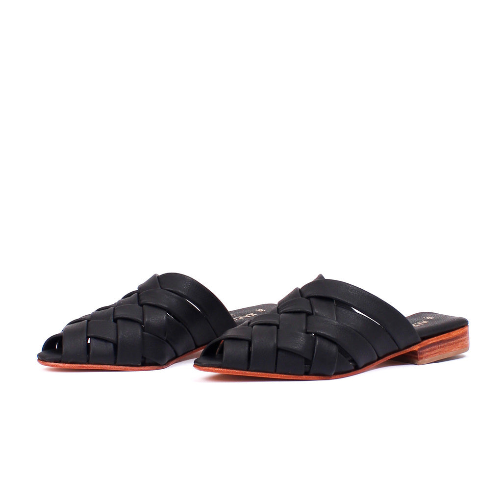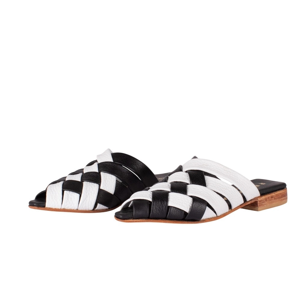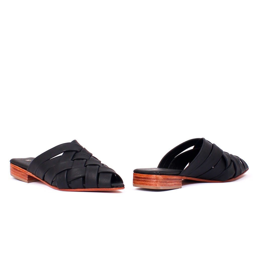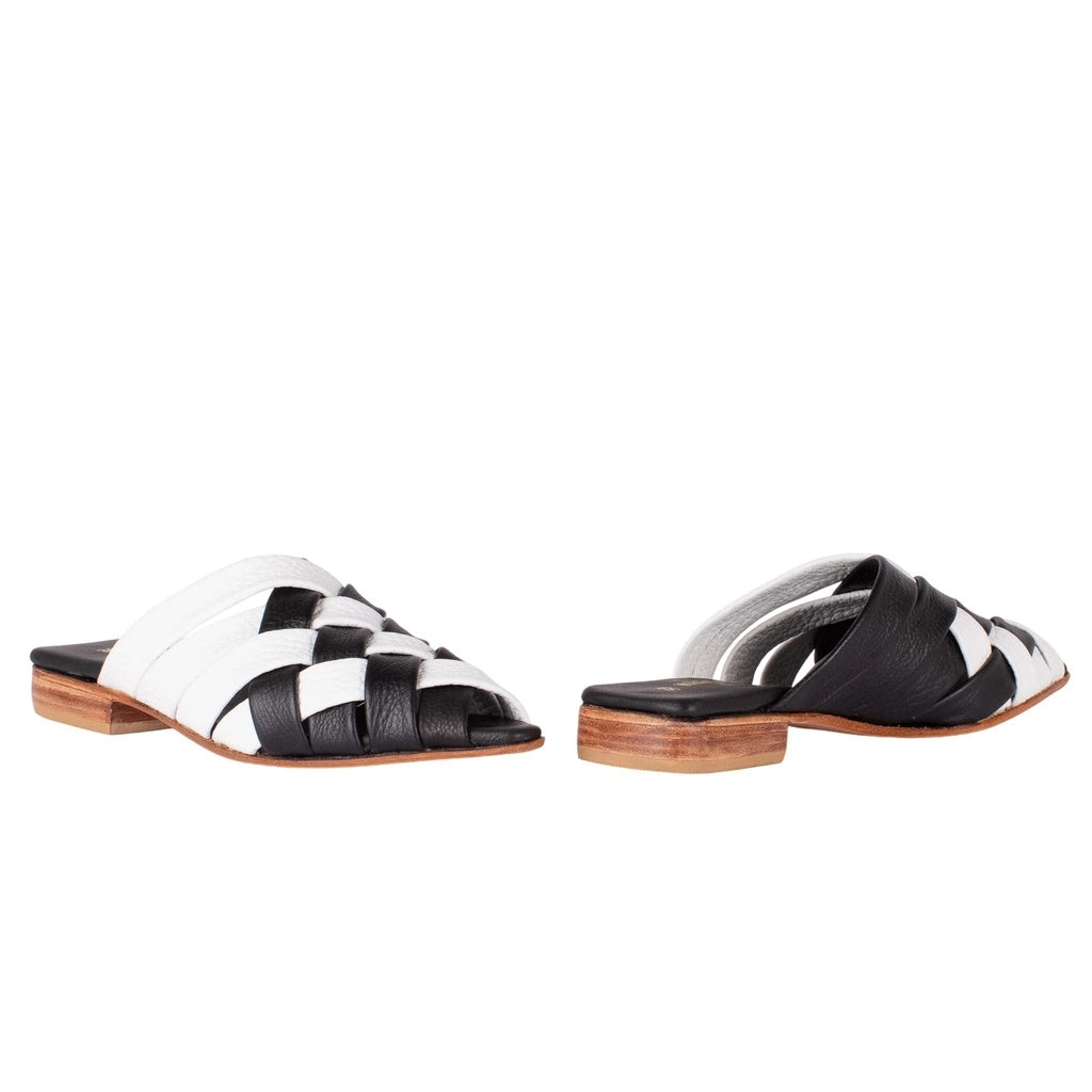 Zueco confeccionado íntegramente en cuero vacuno con detalle de tiras entrelazadas.