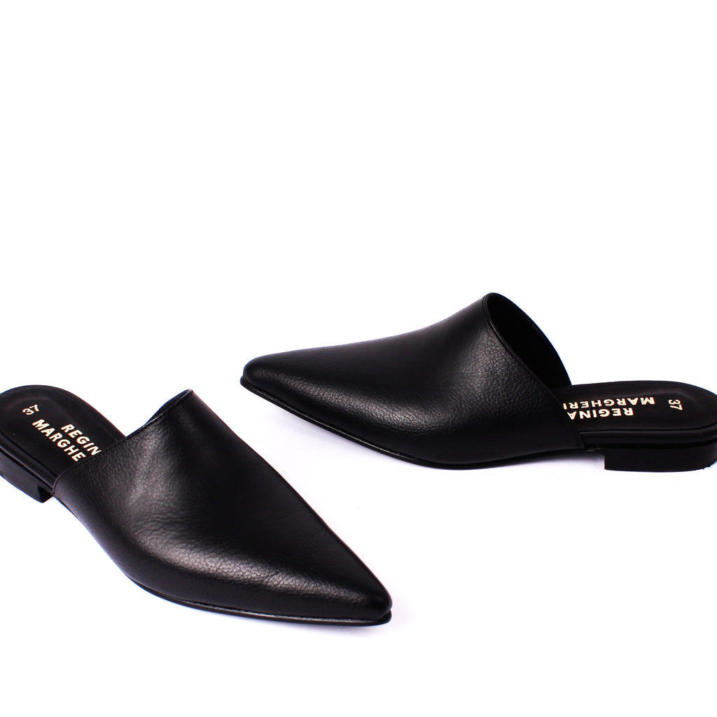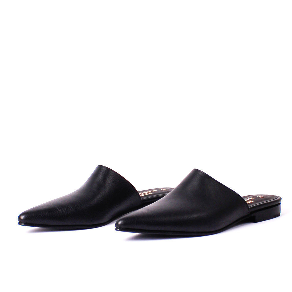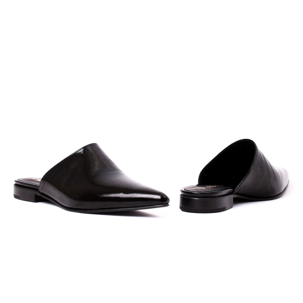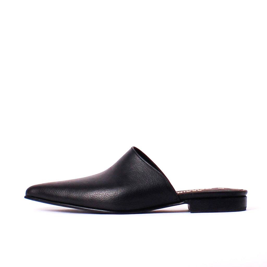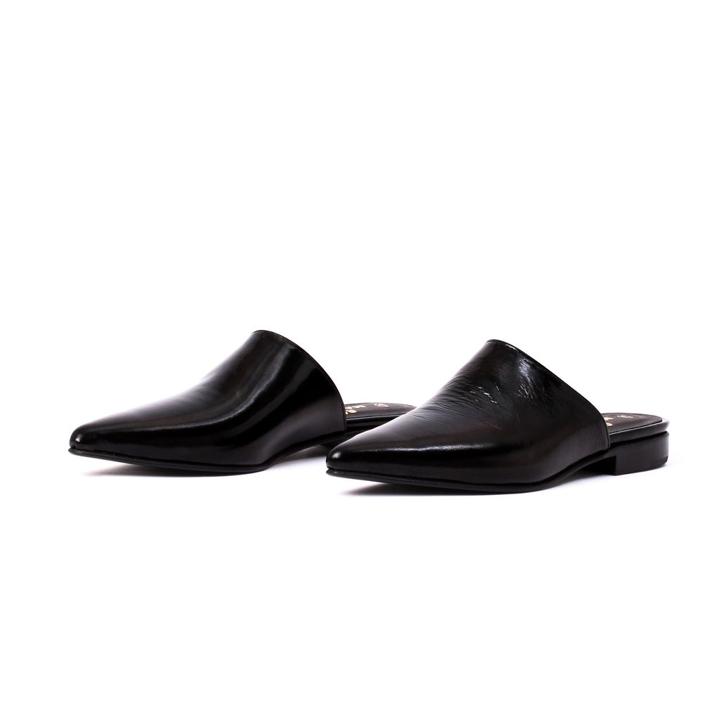 Zueco confeccionado íntegramente en cuero vacuno con detalle de punta fina.