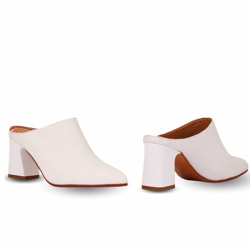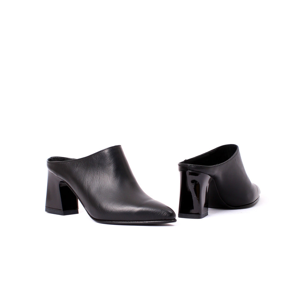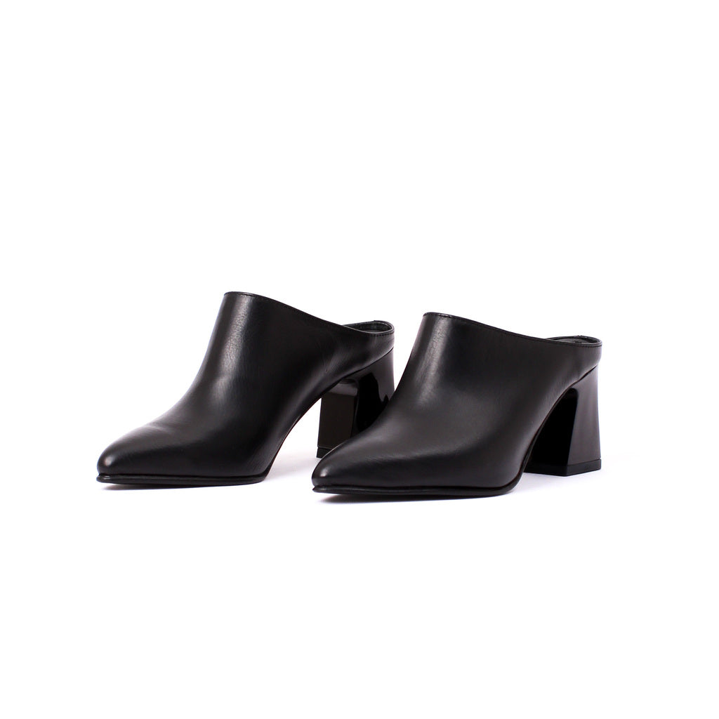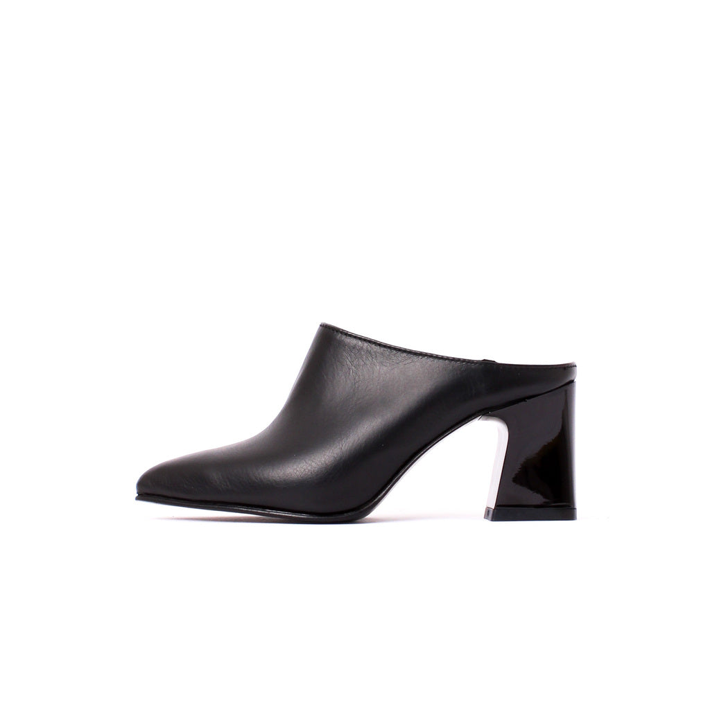 Zueco con punta fina confeccionado íntegramente en cuero y forrería en cuero.