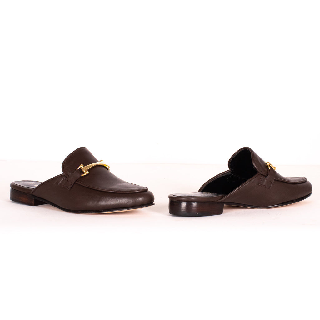 Zueco confeccionado íntegramente en cuero vacuno con detalle de estribo bañado en oro 24 kilates.